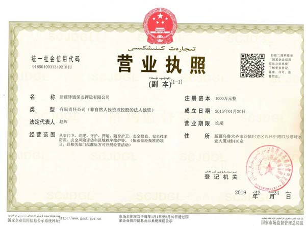 新疆驛通保安押運有限公司,注冊資本1000萬元人民幣,具有獨立法人資格,下設部門有:綜合管理辦公室、人力資源部、指揮中心、保衛部、財務部、業務部、押運部、督察隊、公司金庫。公司建立了符合市場和現代企業要求的經營運作模式和管理機制,有一套較科學的經營管理制度、守押勤務制度、守押作業規范化操作制度和標準。
